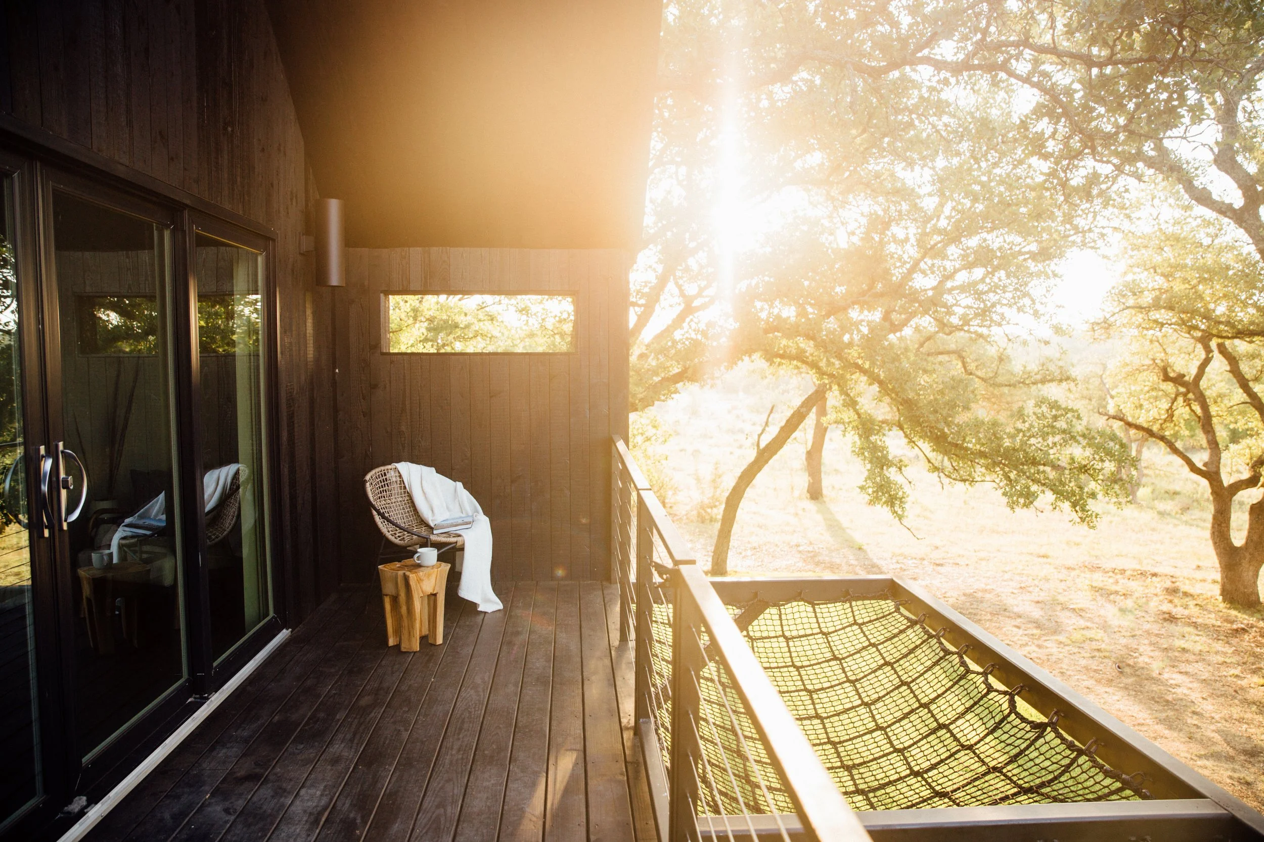 A quiet retreat designed for two, this space offers more room than our cabins. Modern, minimalist, and comfortably lux, it features an open living area with floor-to-ceiling glass that opens to nature, a king canopy bed upstairs, and a suspended two-person hammock deck ideal for resting, reading, or watching the day slow down. Outside, a warm-weather soaking tub is nestled among the trees, along with a fire pit and grill for unhurried evenings.